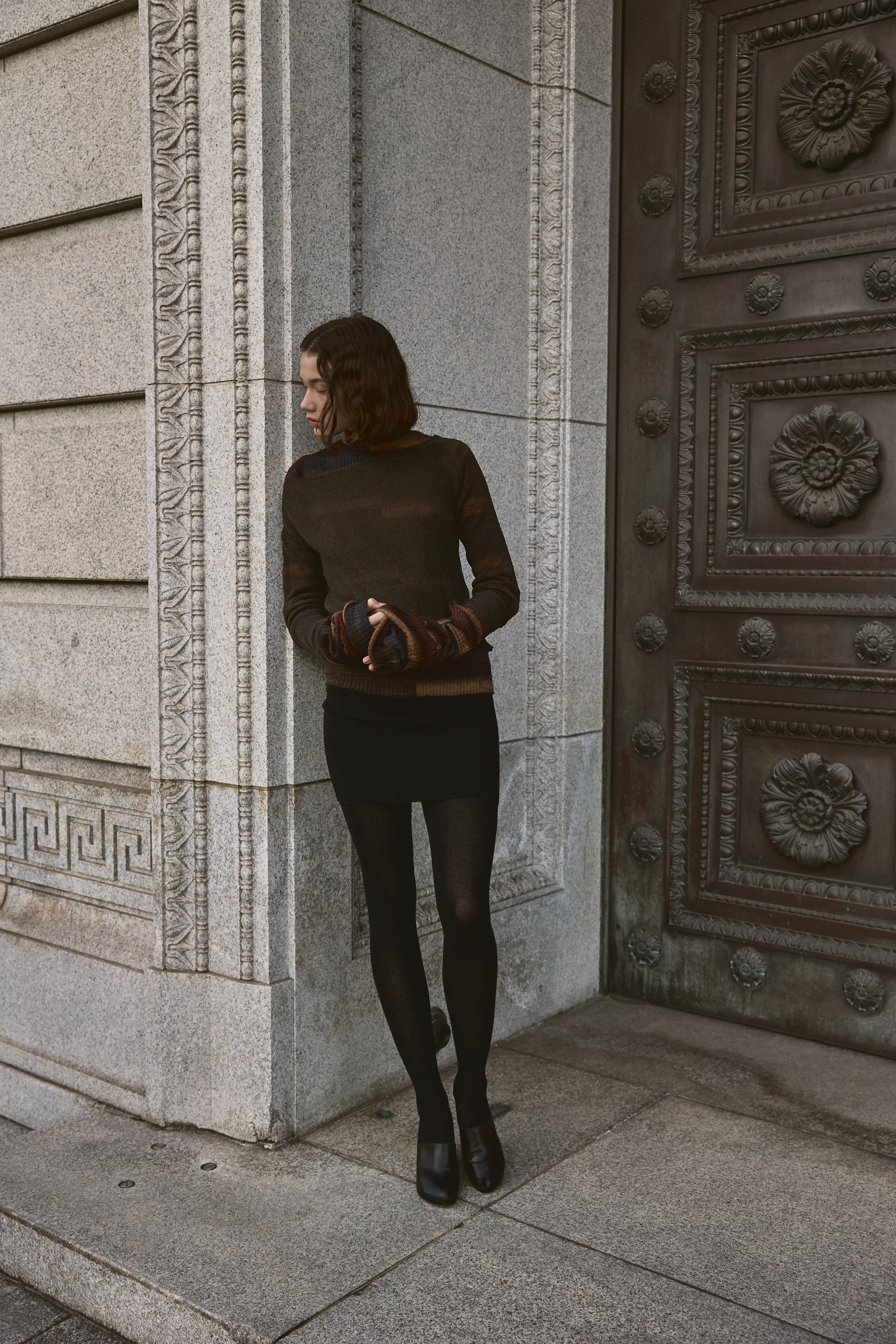 身頃のセンターラインを切り替える事で左右グラデーションの異なる見え方がポイント。大胆に長い袖は、寄せ上げてニュアンスを出したり、深く折り返したりアレンジ可能。