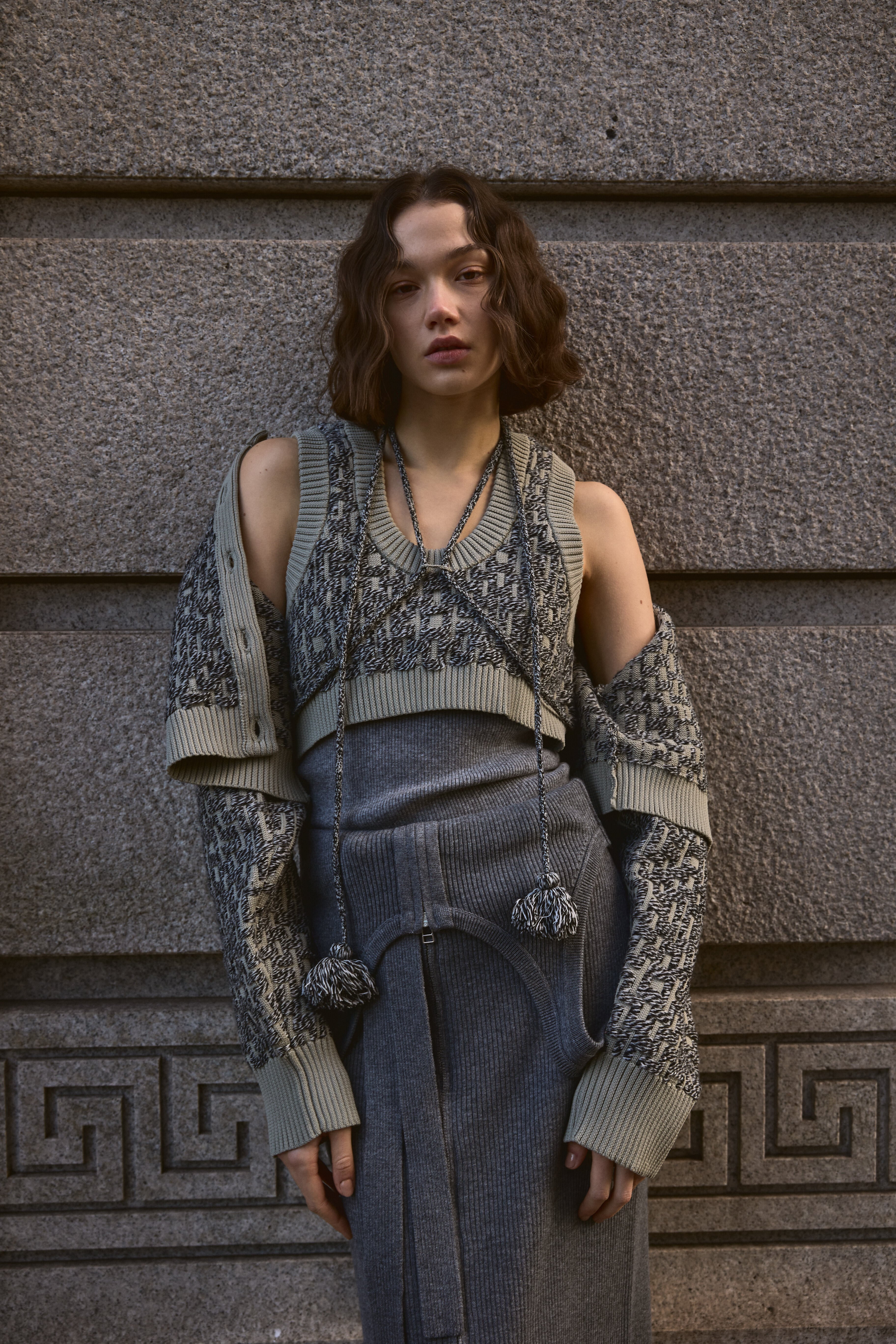 杢糸を糸が横に渡るスレッド編みにすることで幾何学模様を表情豊かに表現。