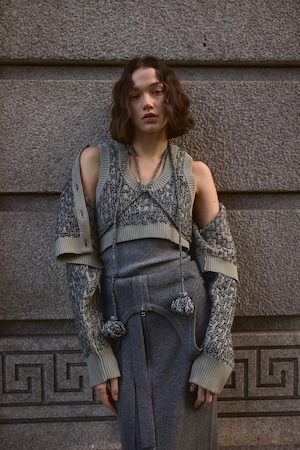 タッセル付きの杢糸の紐はネックに回したりスタイリングのアクセントになる。