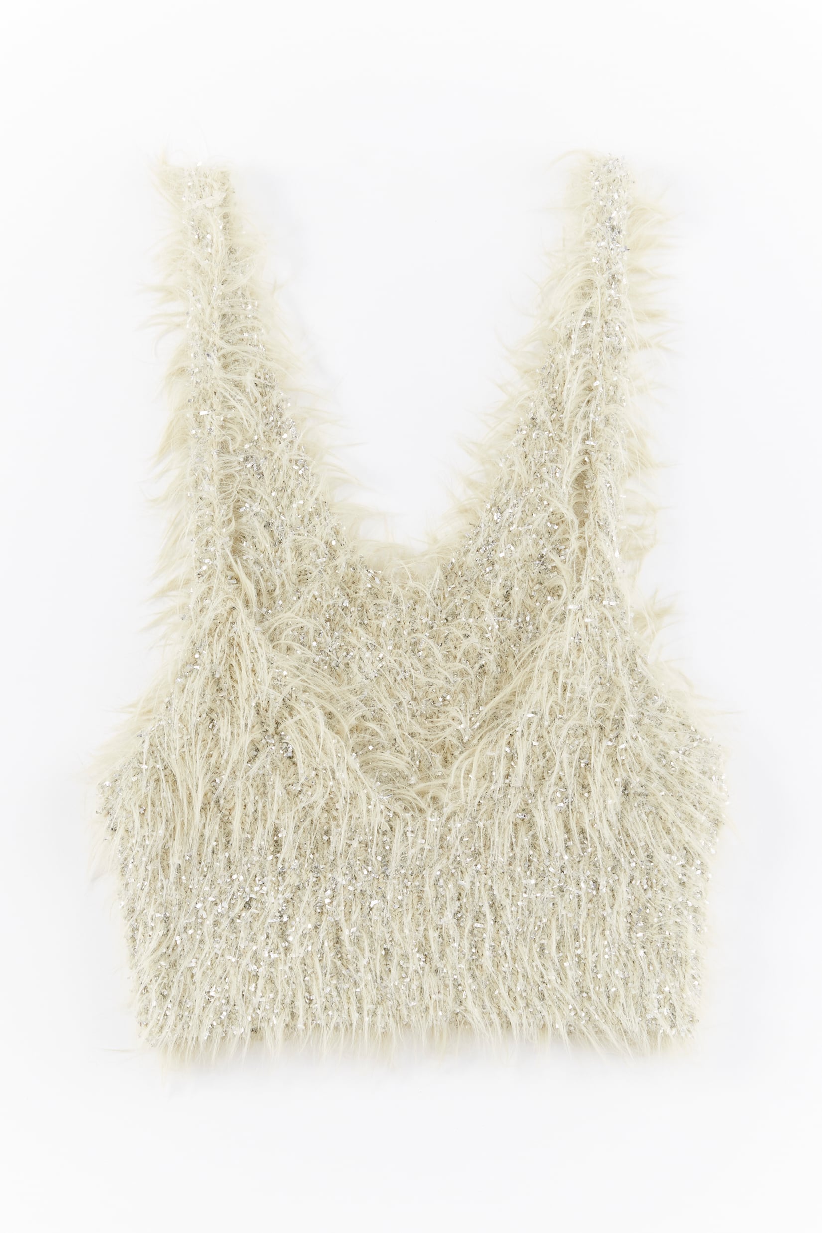 太めのラメフィルムヤーンと毛足の長いフェザーヤーンをミックスしたキャミソール。