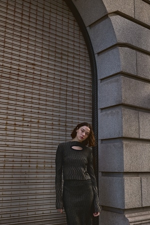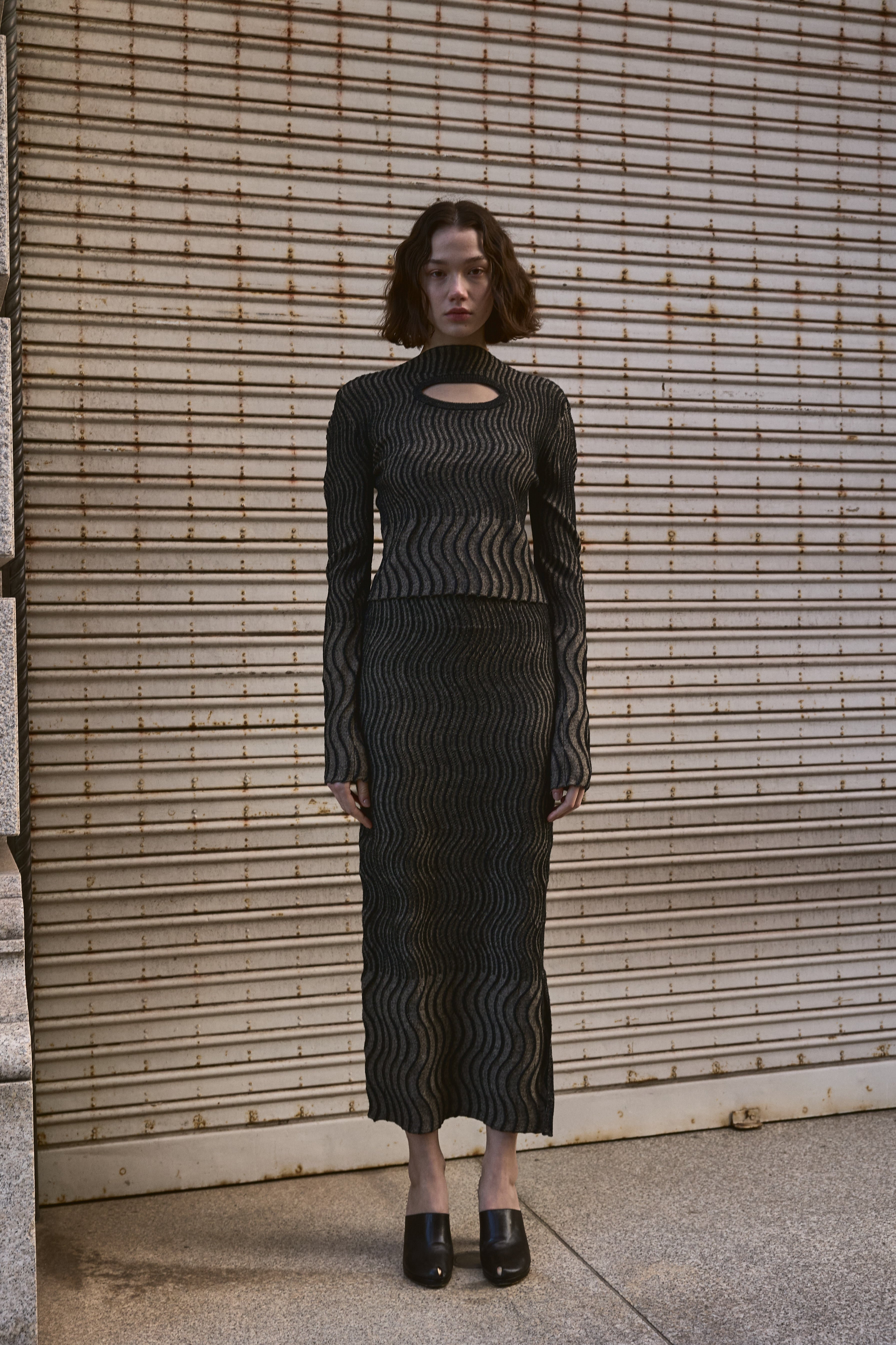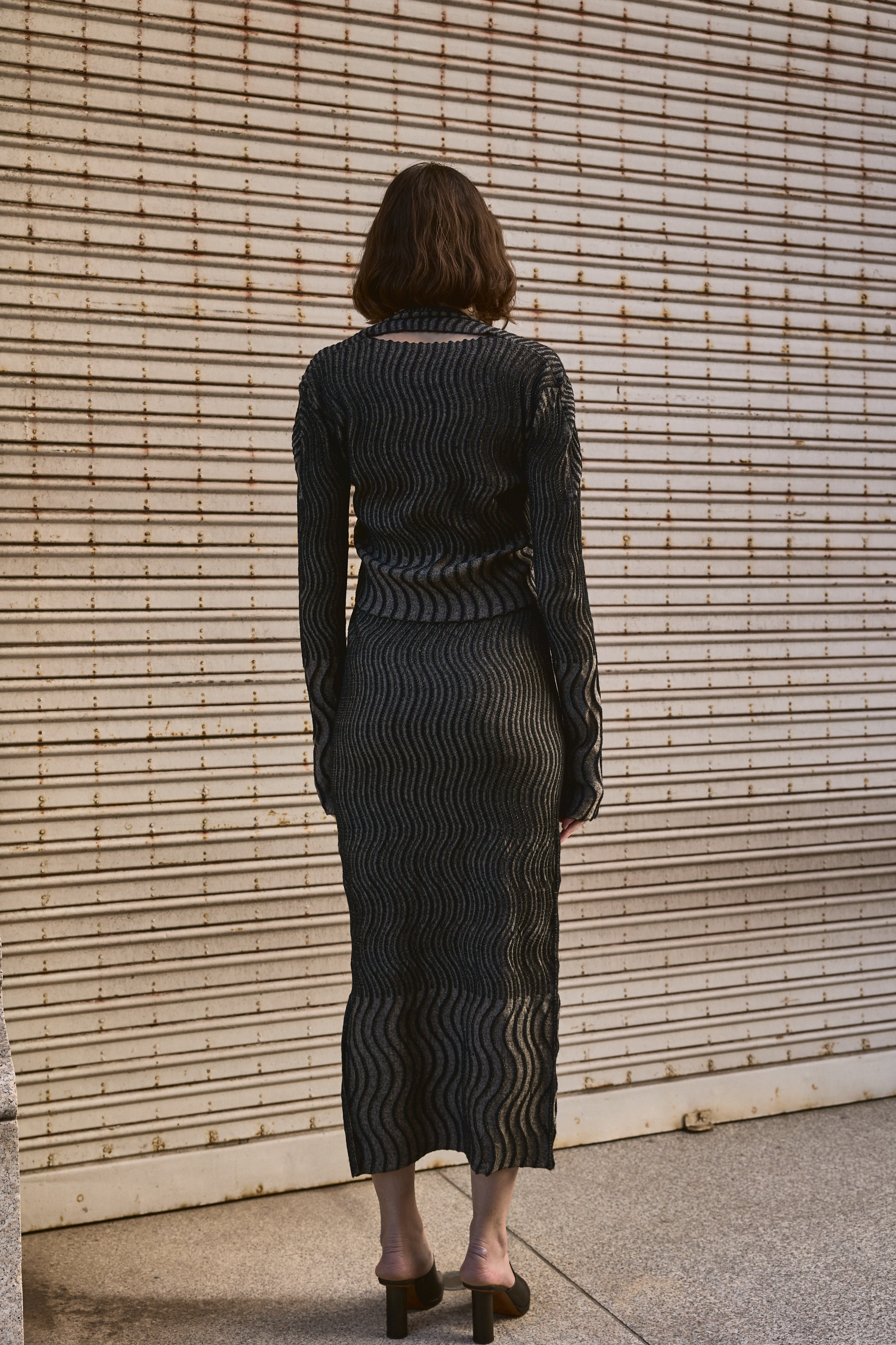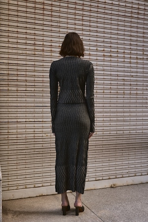 直線と曲線の立体感のあるストライプパターンを編糸の色を表と裏に出し分けるプレーティング編みで表現。