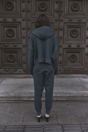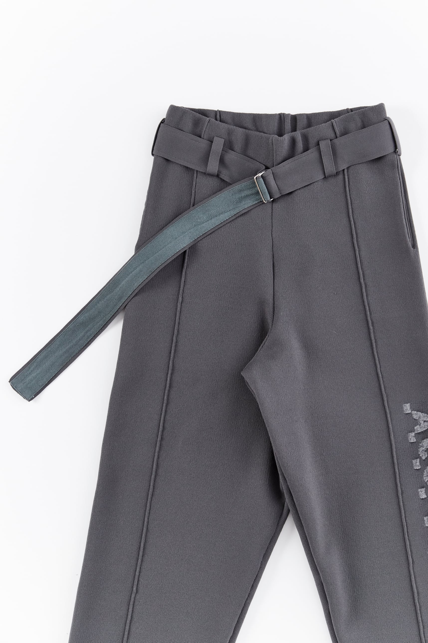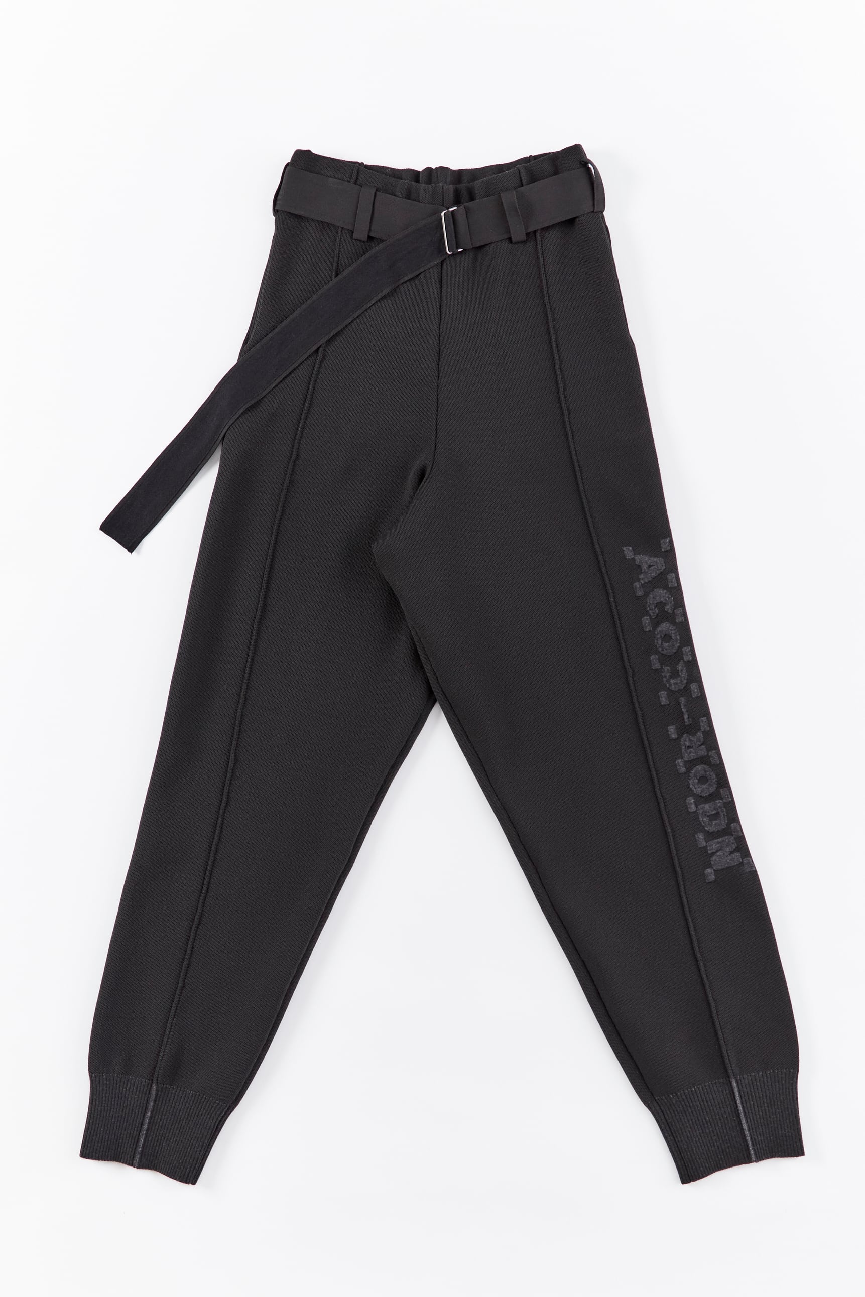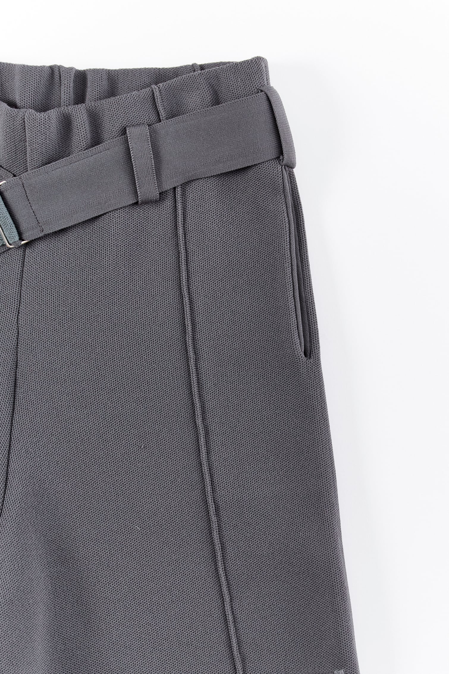 肌離れが良く程良いハリのある綺麗なシルエット。左足の立体的に編み上げたブランド名をもじったロゴがポイント。調節可能なウエストベルト、両脇スラッシュポケット付き。