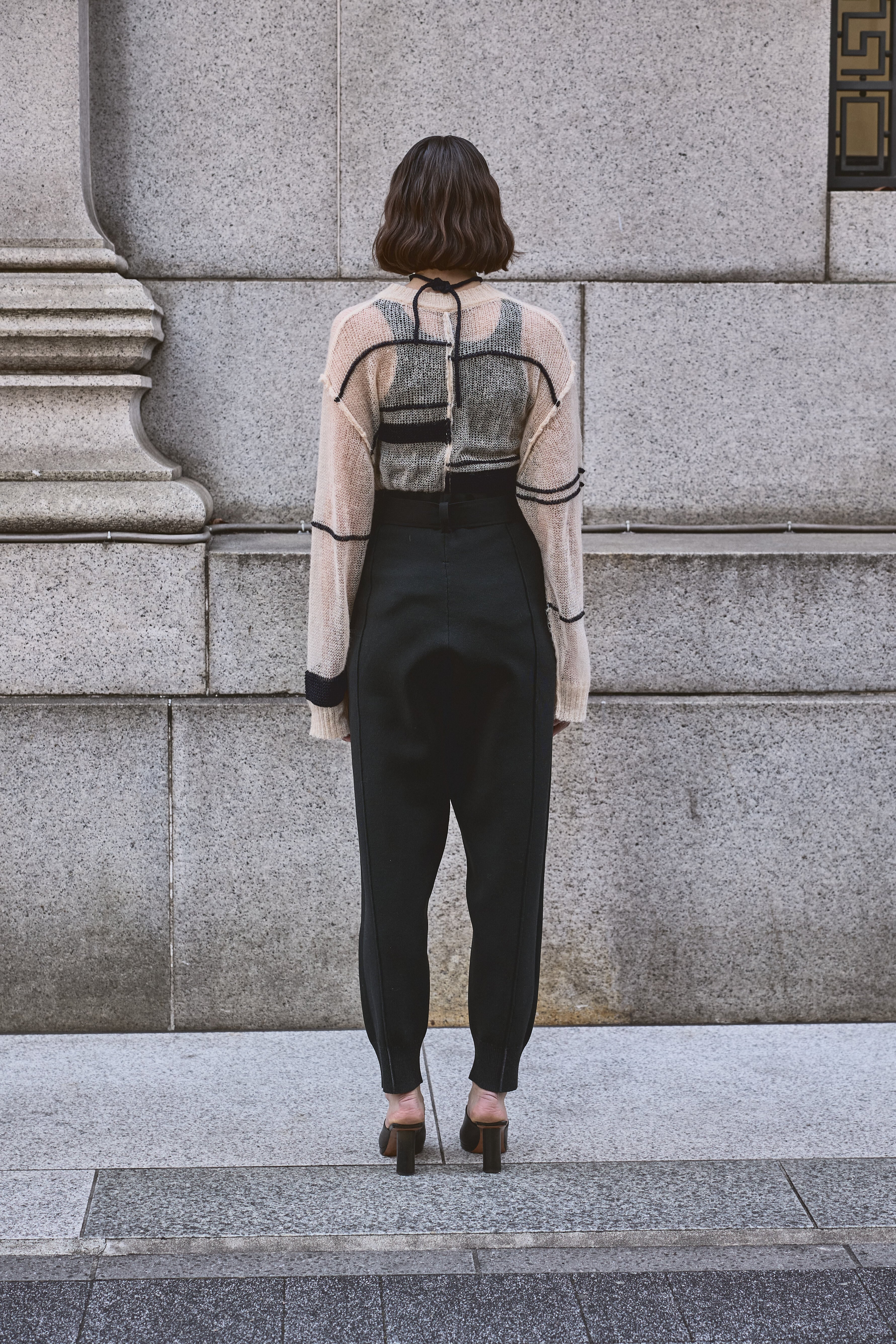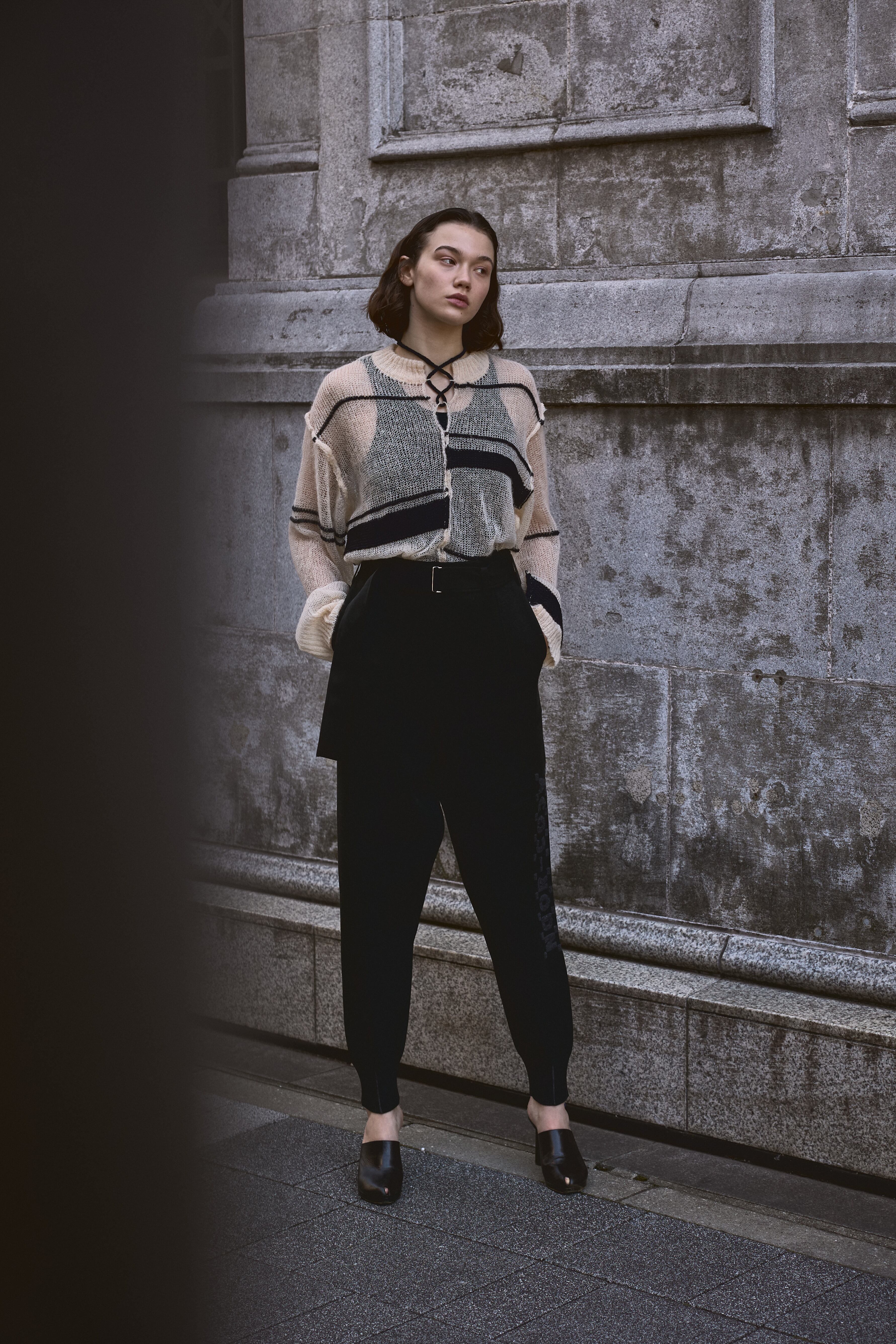 ウール20%の柔らかい糸と、軽くハリ感のある糸をミックスしたピンタックパンツ。