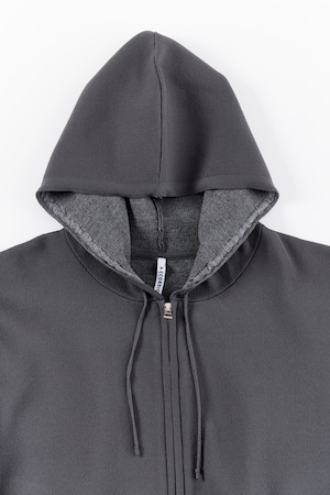 ウール20%の柔らかい糸と、軽くハリ感のある糸をミックスしたジップアップフーディー。