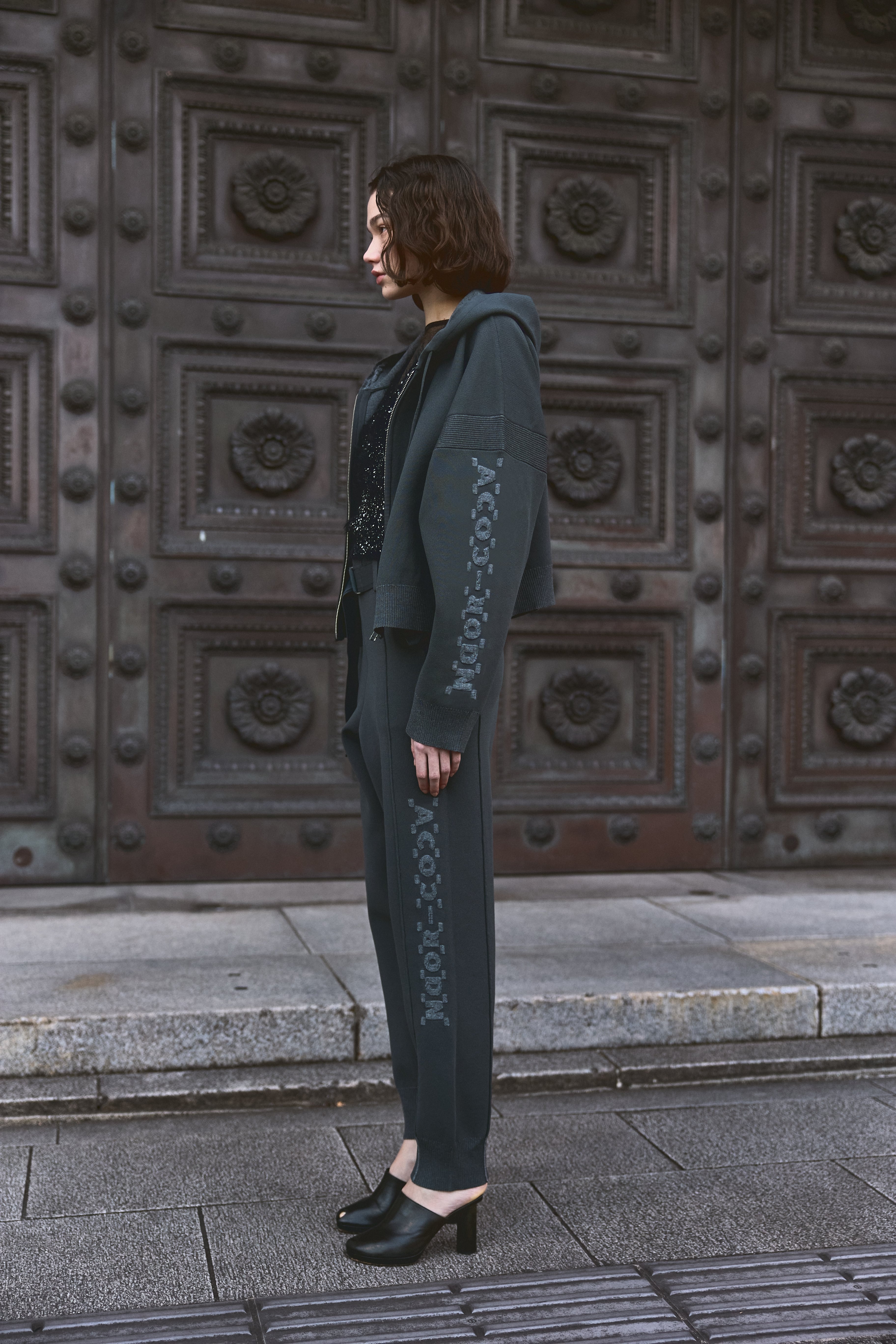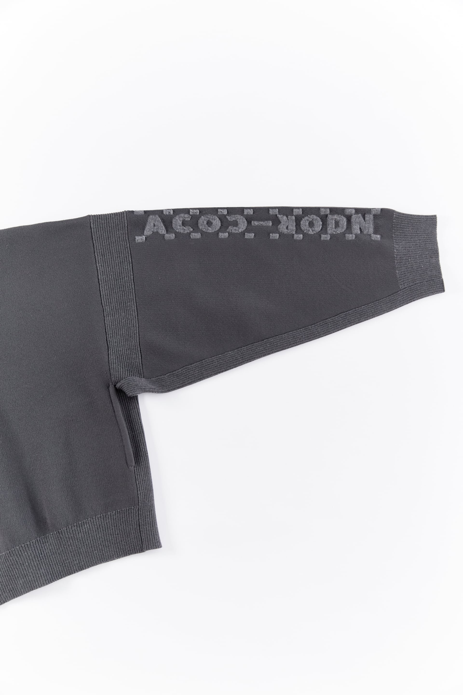 左袖の立体的に編み上げたブランド名をもじったロゴがポイント。