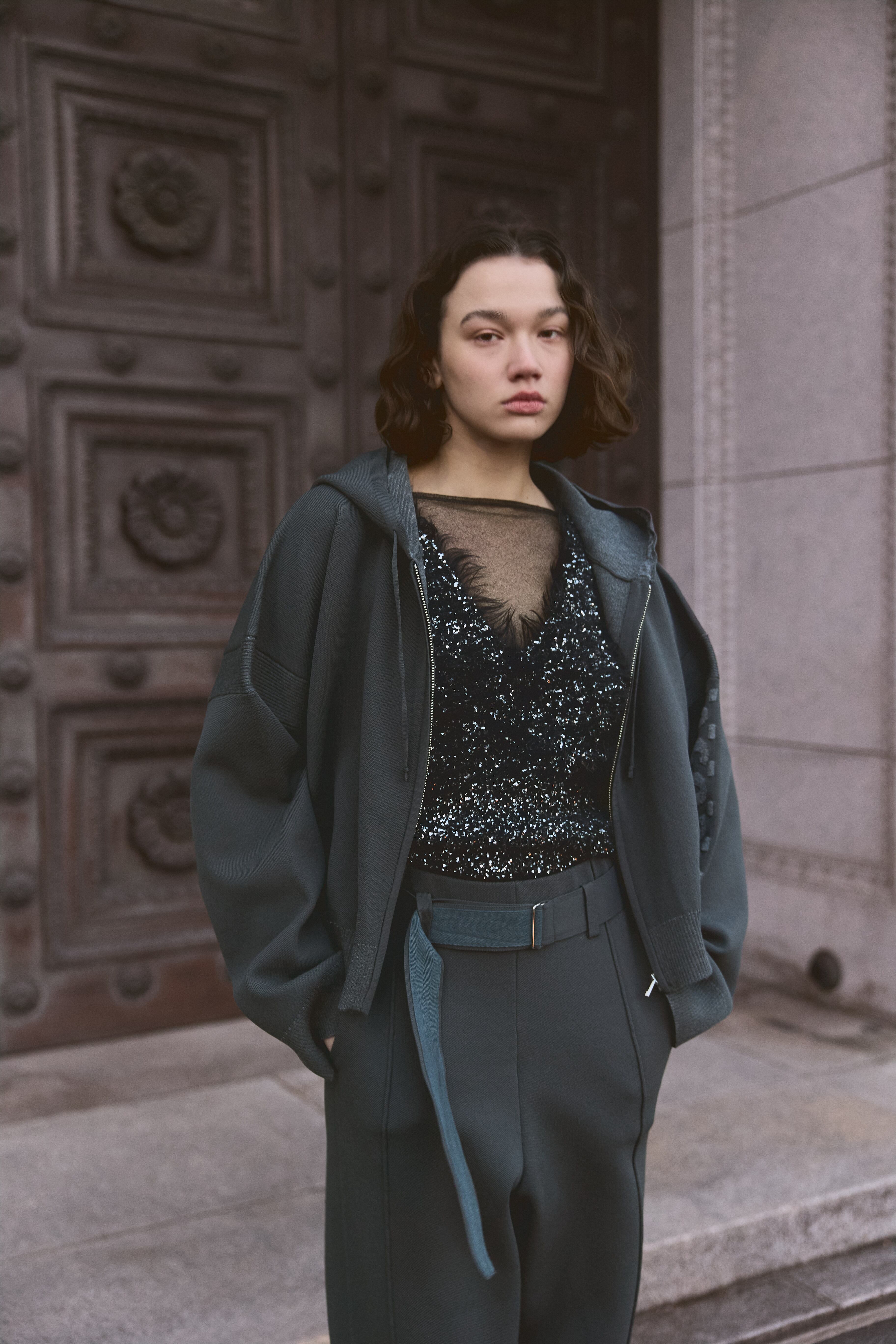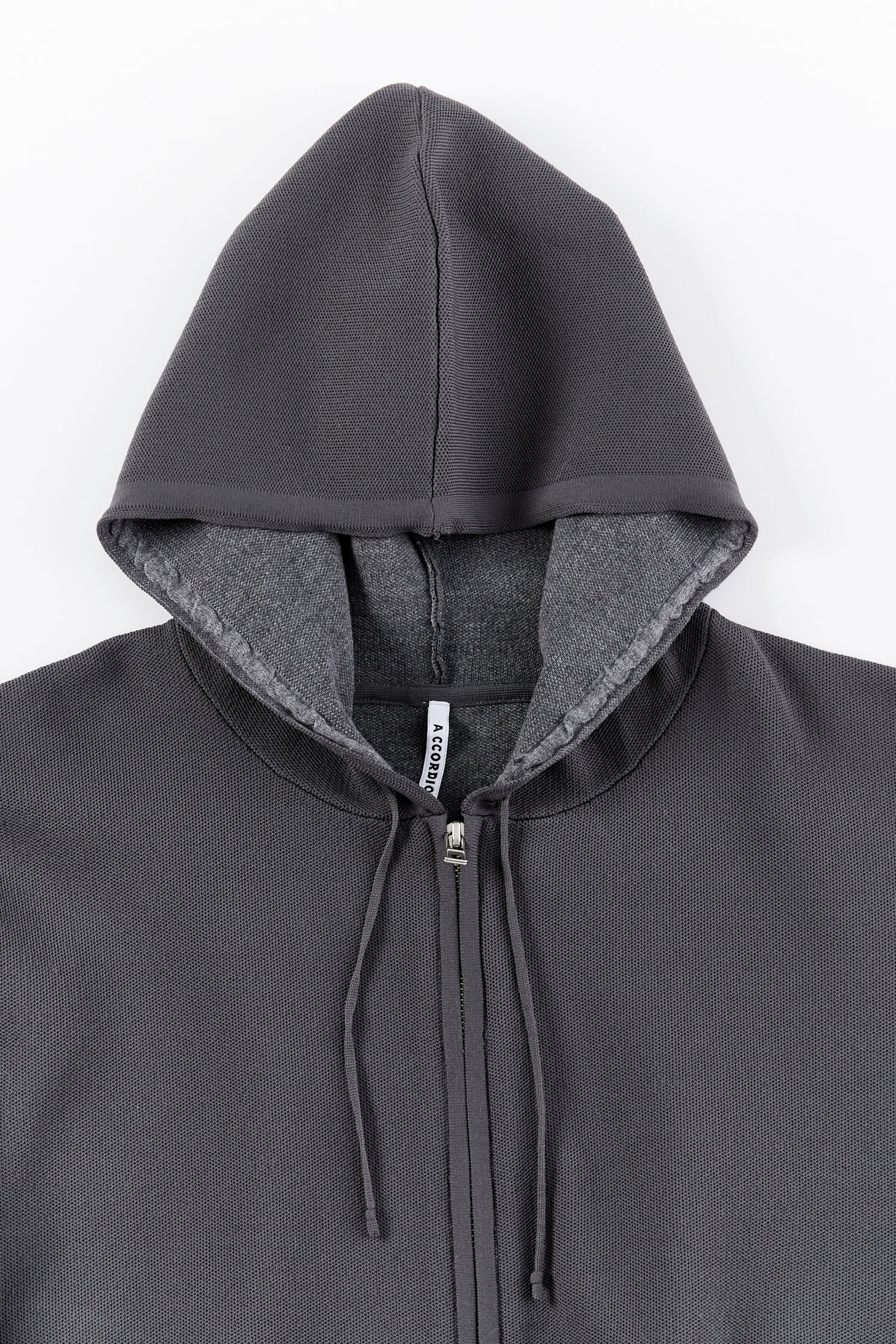 ウール20%の柔らかい糸と、軽くハリ感のある糸をミックスしたジップアップフーディー。