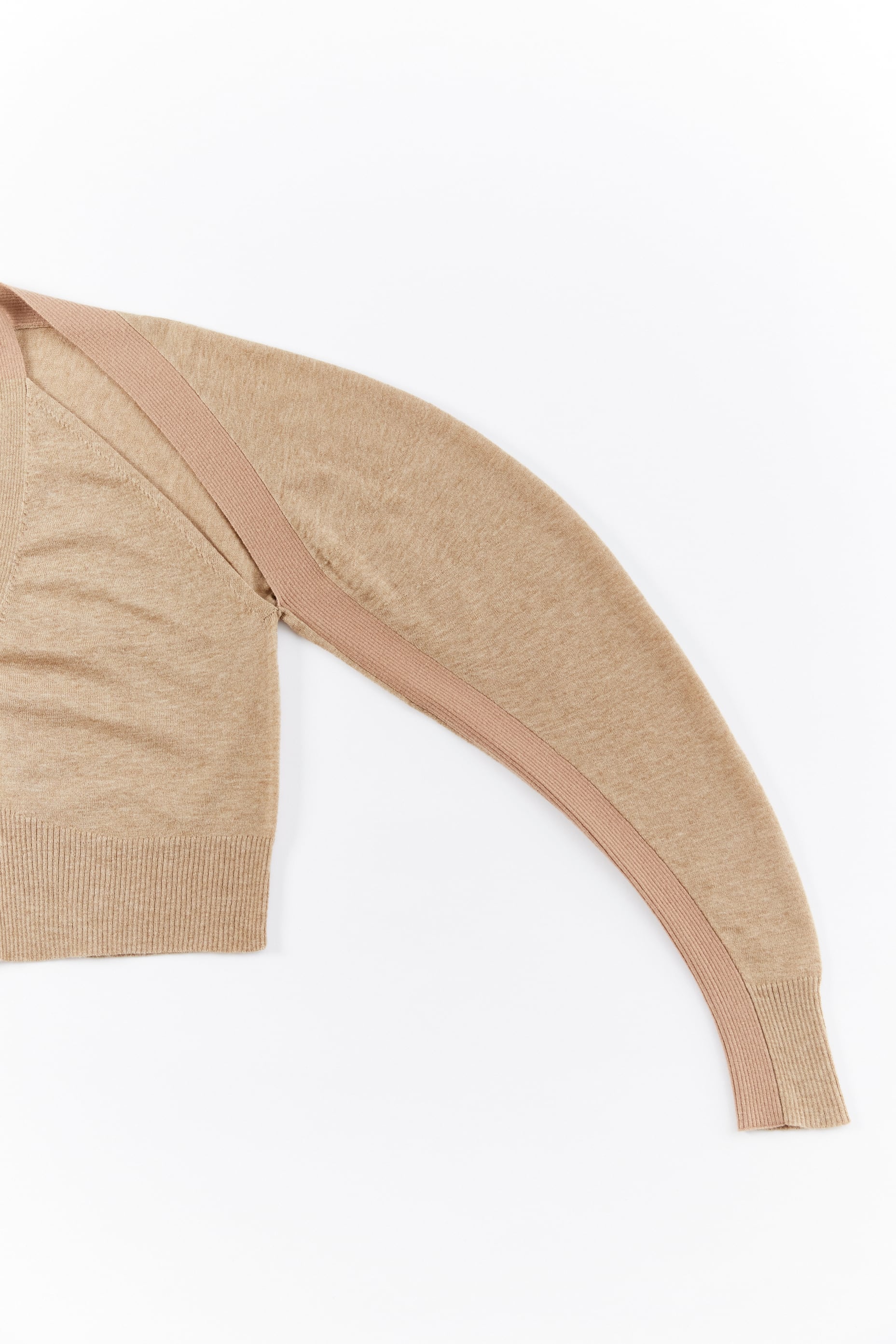 袖は、少しカーブを付けたニュアンスのあるシルエットに、袖下リブ切替で張りを出しているのがポイント。