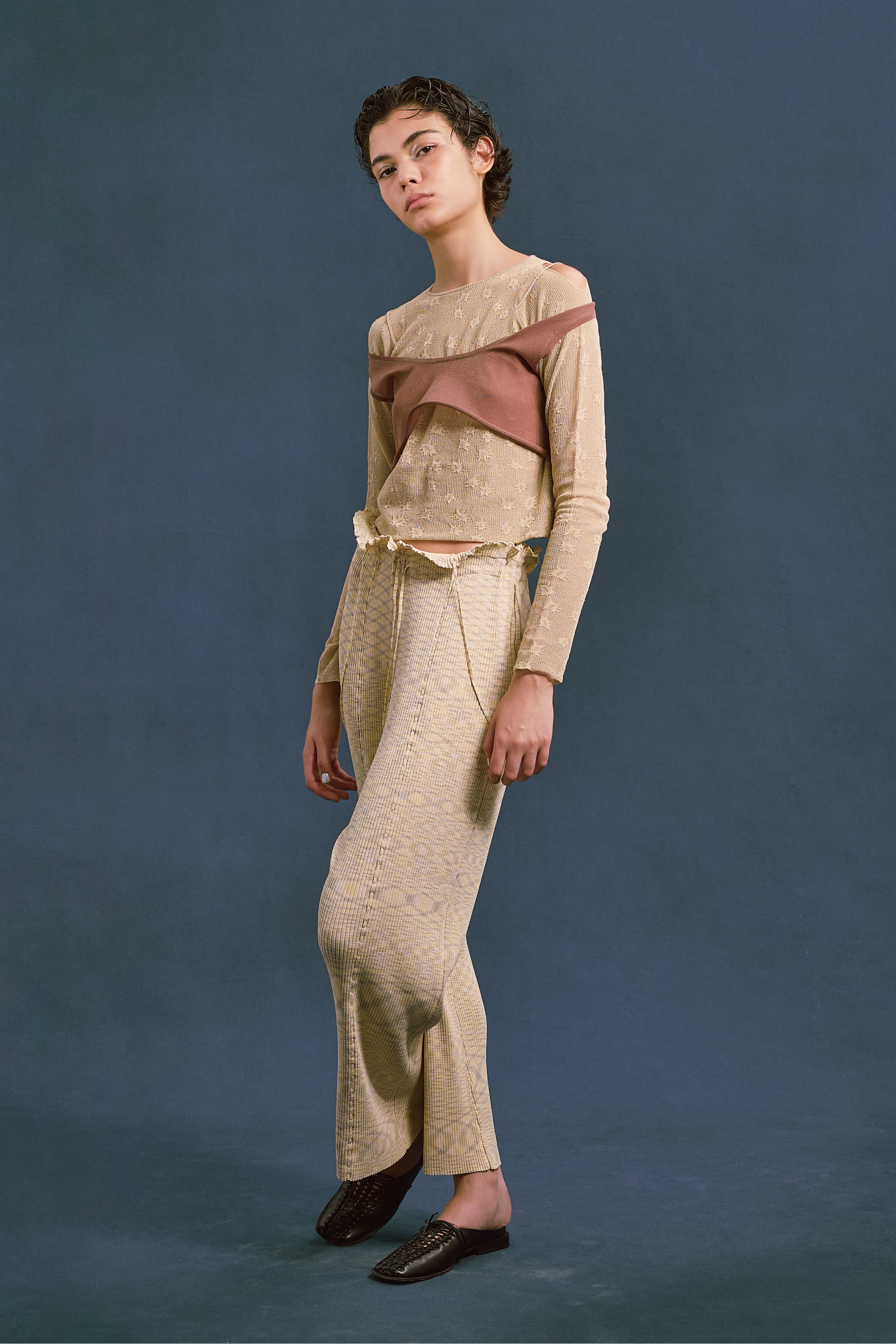 ショート丈のタンクトップと長袖プルオーバーのセット。タンクトップは前後逆に着用することで異なる衿開きの違いを楽しめる2WAYタイプ。