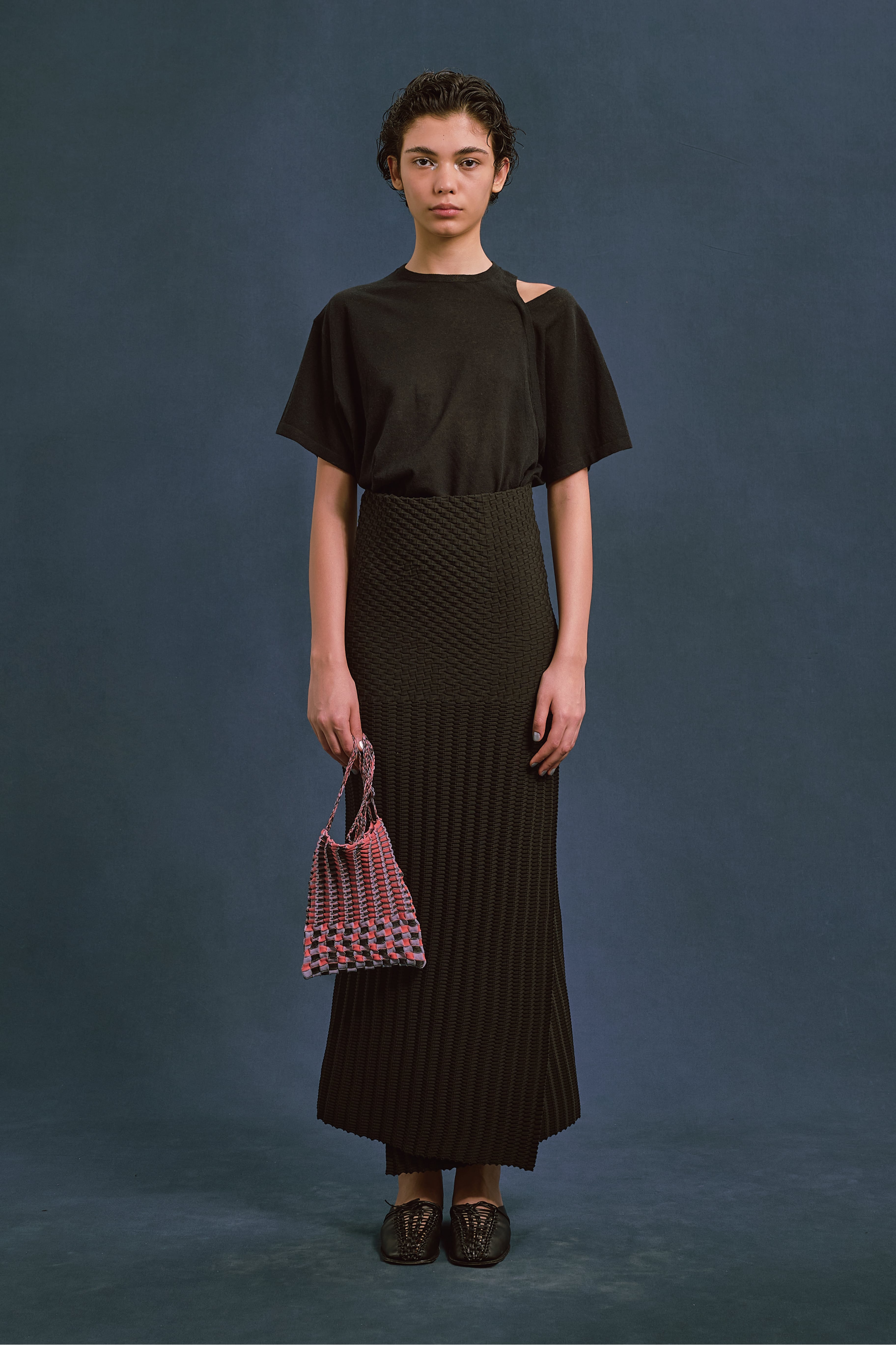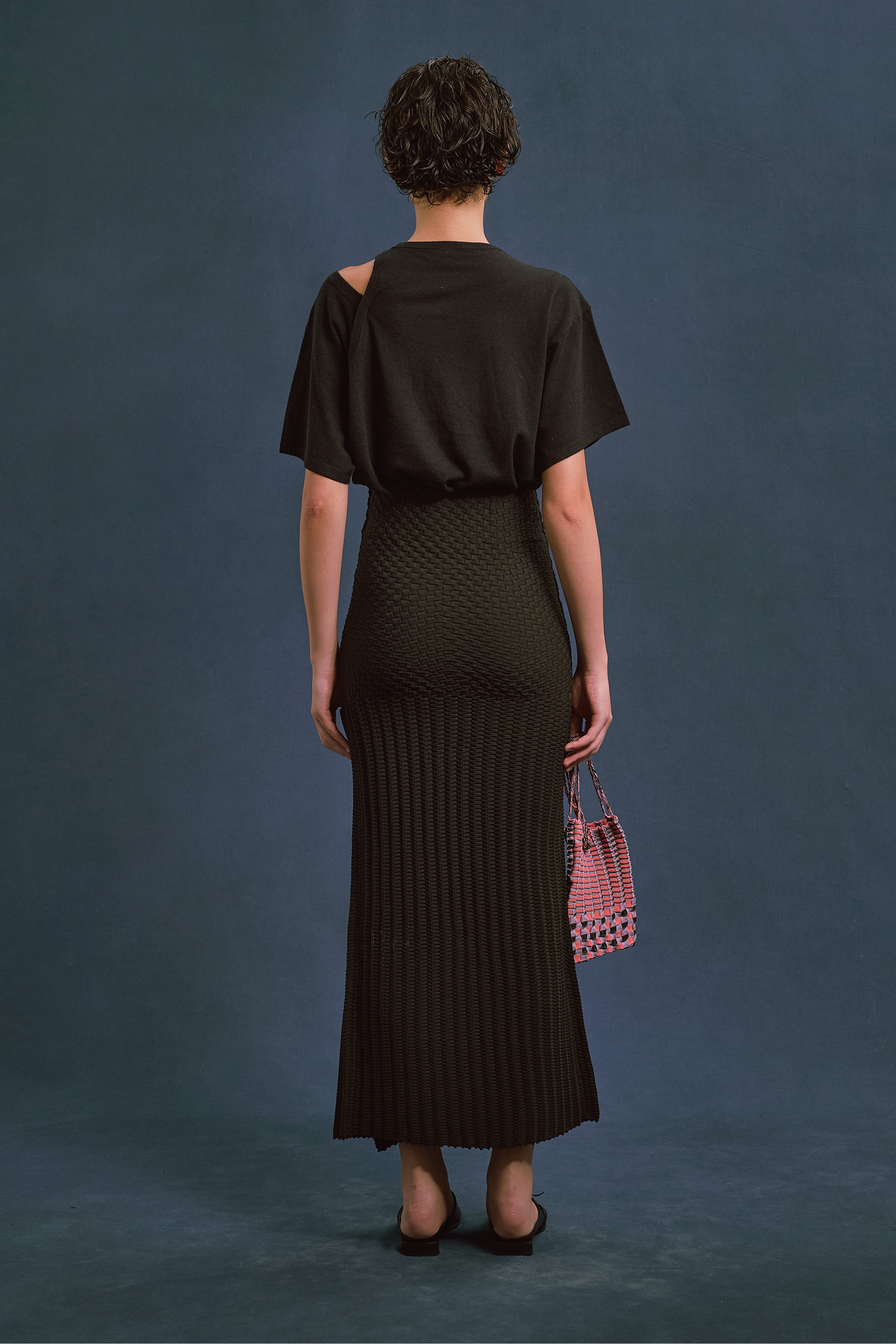 左肩のスリットデザインを生かし、袖を肩から落としたアレンジも可能。