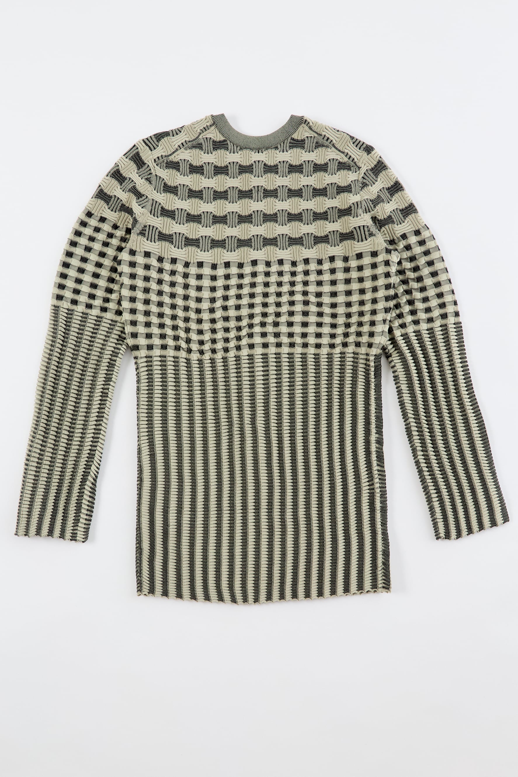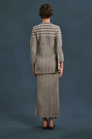 3つの立体感の出るリンクス柄とプレーティング技法を組み合わせた表情豊かな編地。