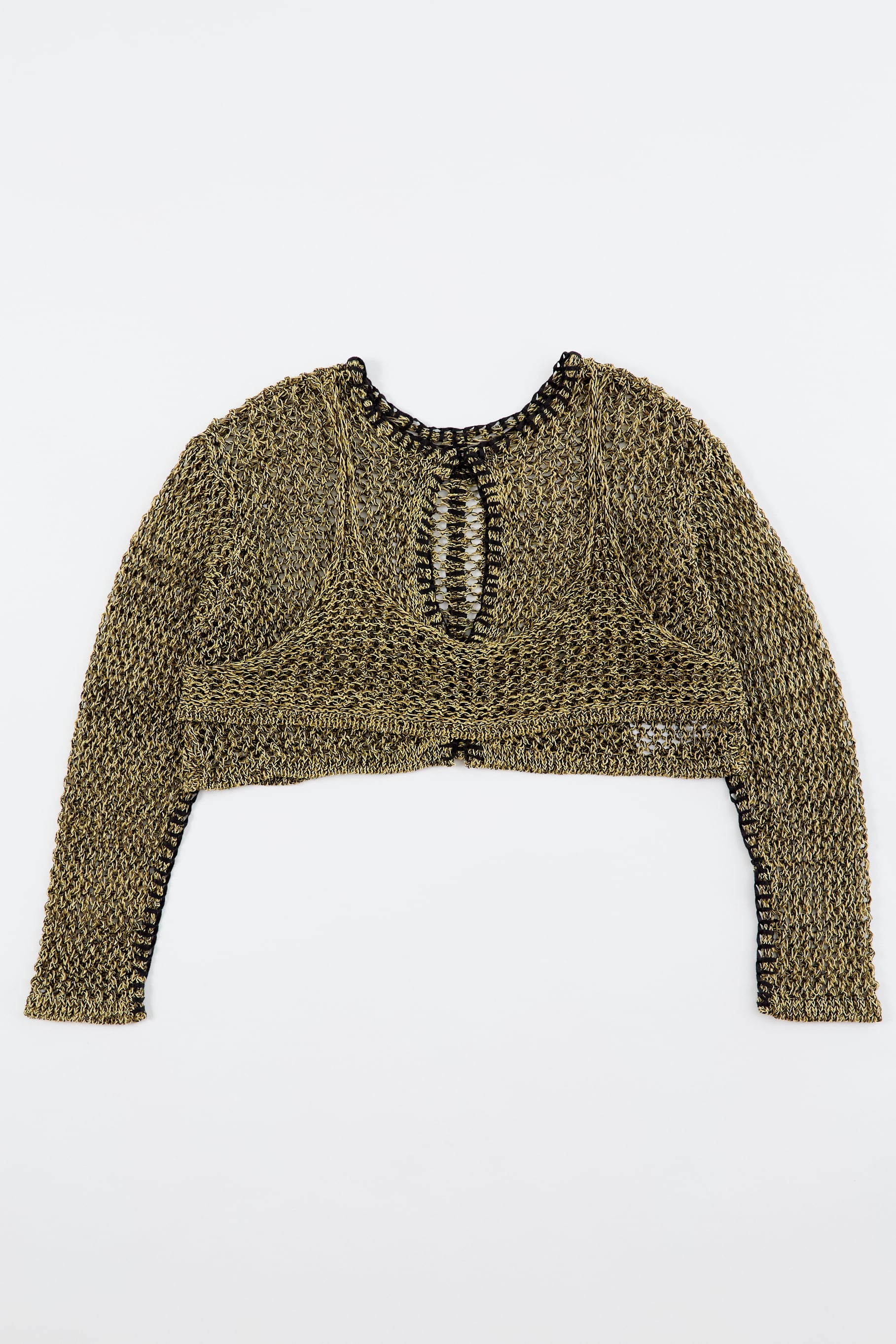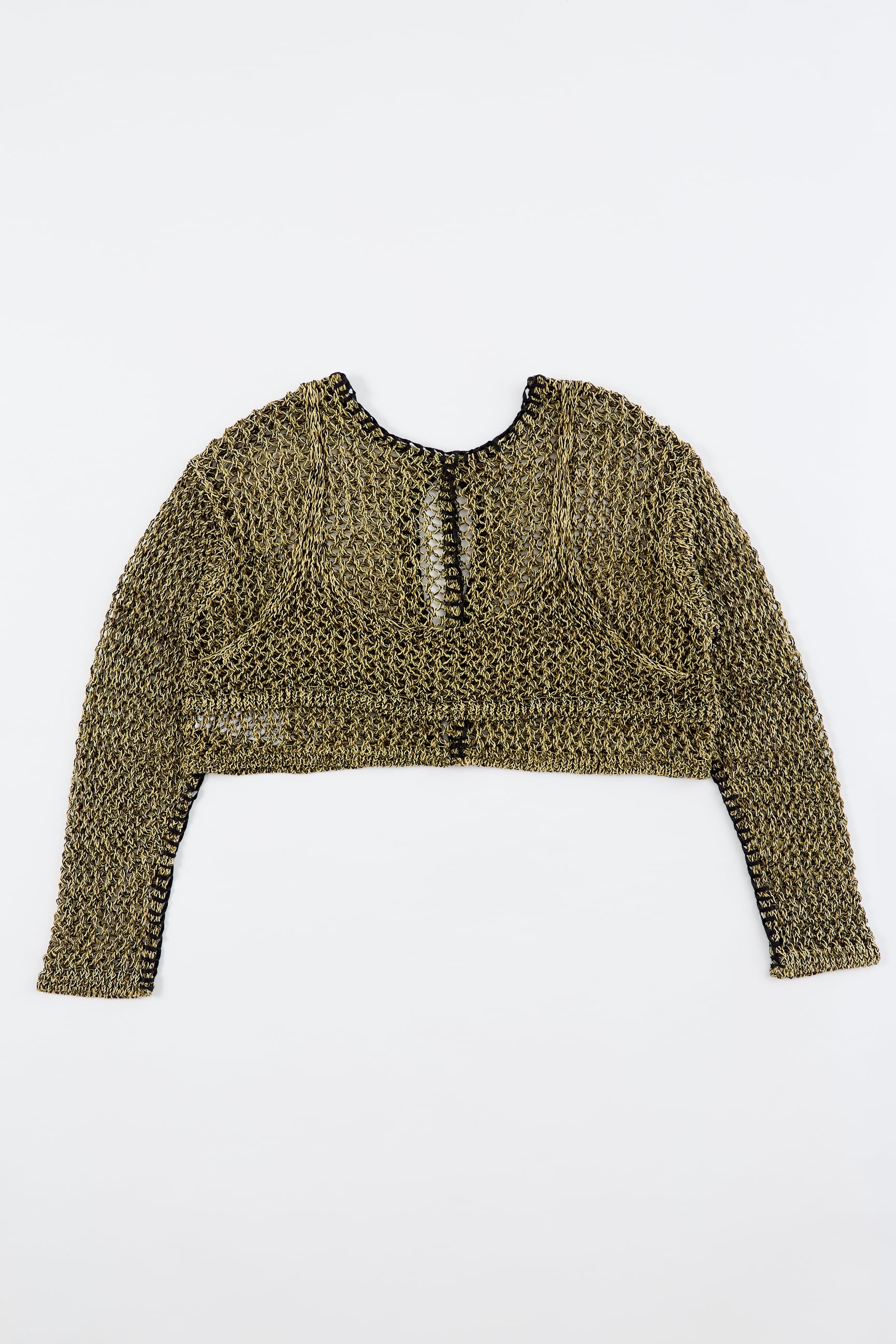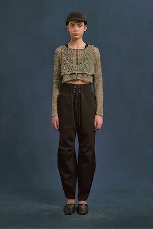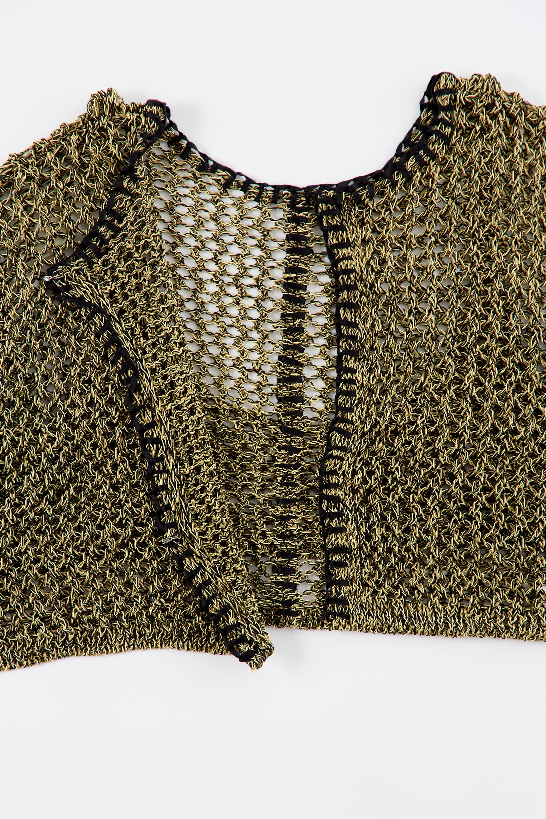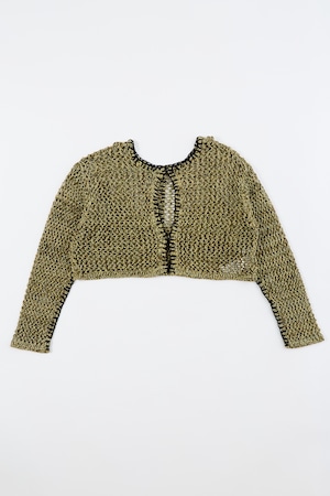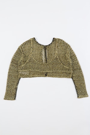 ほのかな光沢のあるコイルヤーンを使用。3色をミックスした立体感のあるメッシュ柄編み。端に施された不織布糸のブランケットステッチがポイント。胸元のブラトップパーツが重ね着ライクなデザイン。ブラトップパーツは後側に回して着用したりアレンジ可能。開きは2段のスプリングホック仕様。前後逆に着用可能で4WAYタイプ。