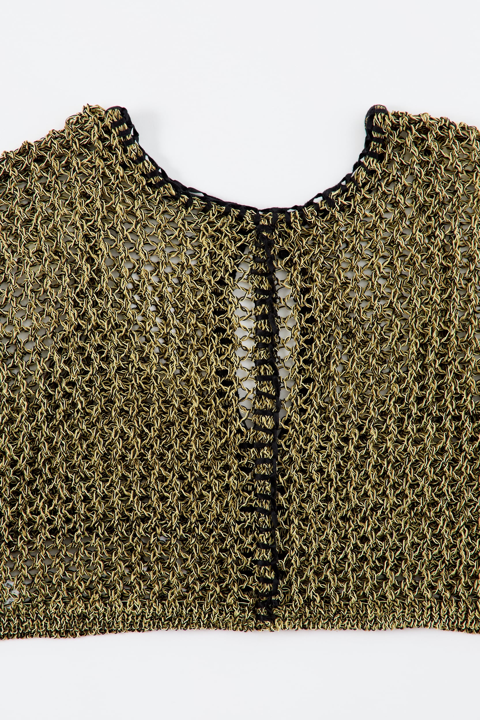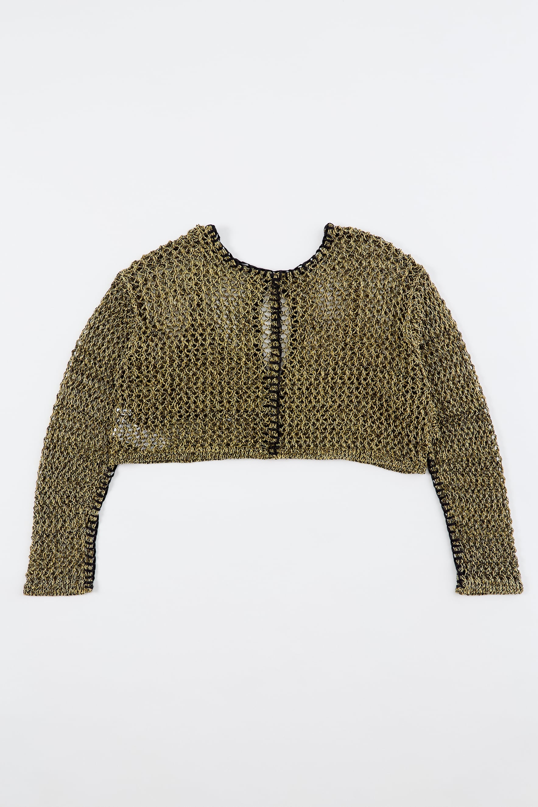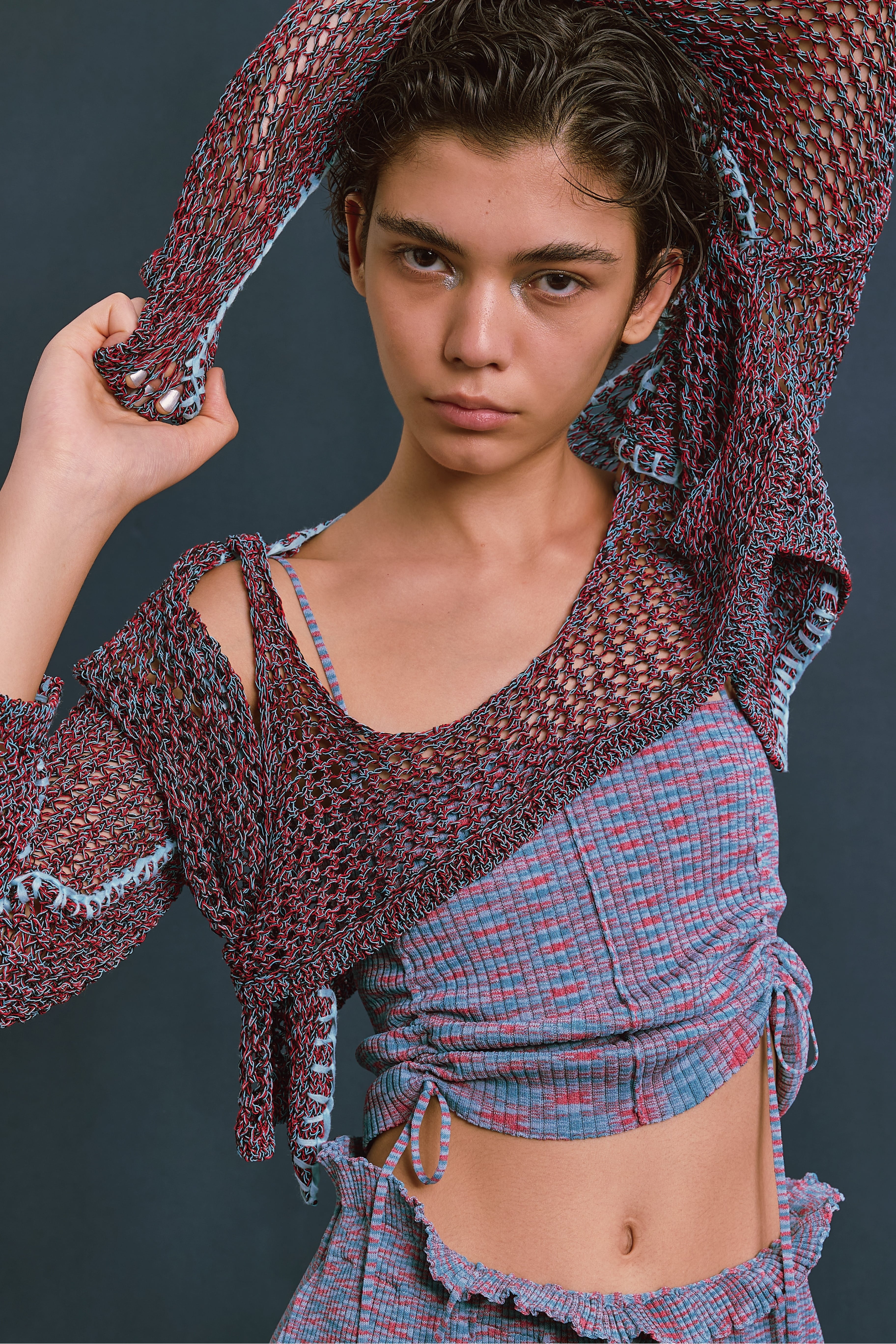 ほのかな光沢のあるコイルヤーンを使用。3色をミックスした立体感のあるメッシュ柄編み。端に施された不織布糸のブランケットステッチがポイント。胸元のブラトップパーツが重ね着ライクなデザイン。ブラトップパーツは後側に回して着用したりアレンジ可能。開きは2段のスプリングホック仕様。前後逆に着用可能で4WAYタイプ。