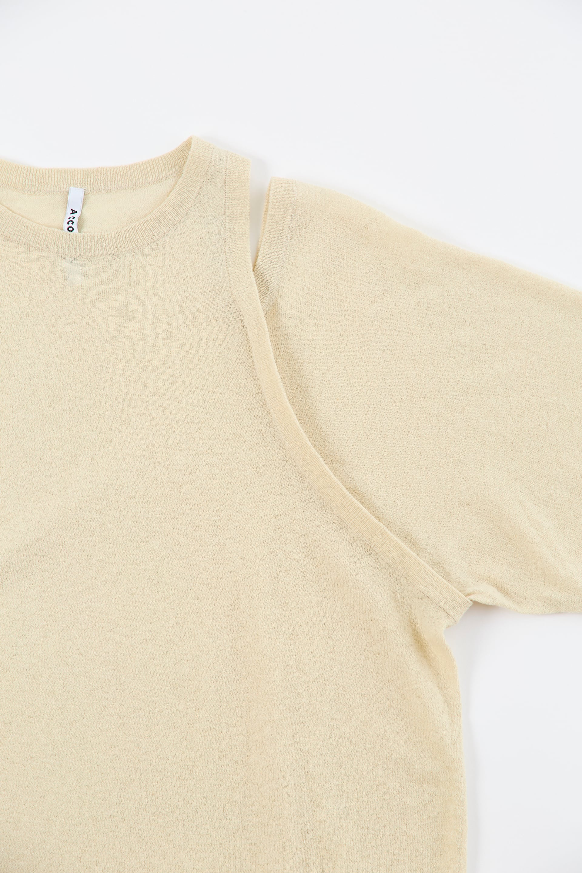 左肩のスリットデザインを生かし、袖を肩から落としたアレンジも可能。