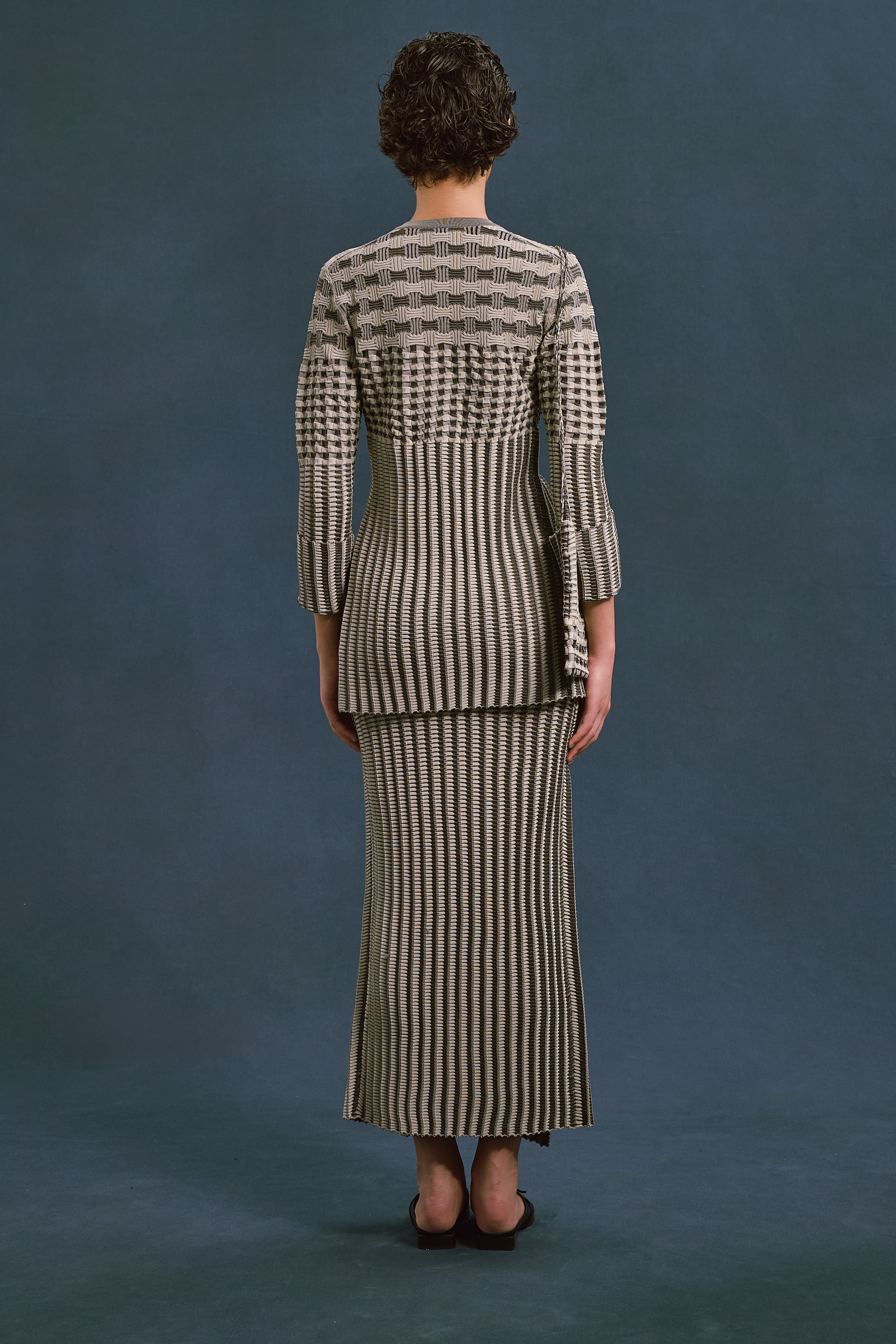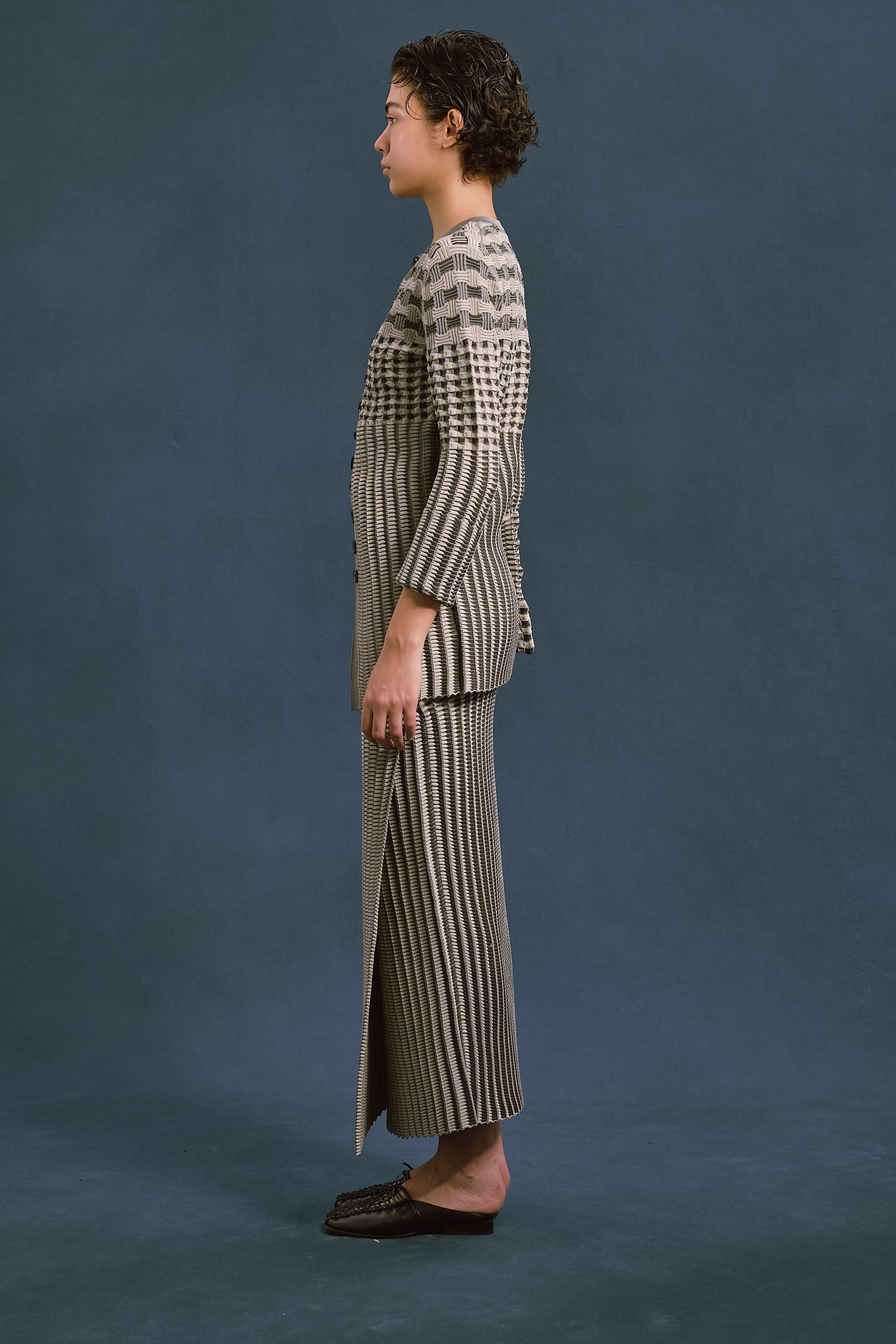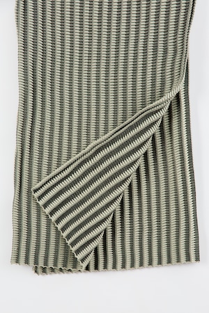 2つの立体感の出るリンクス柄とプレーティングを組み合わせた表情豊かな編地。