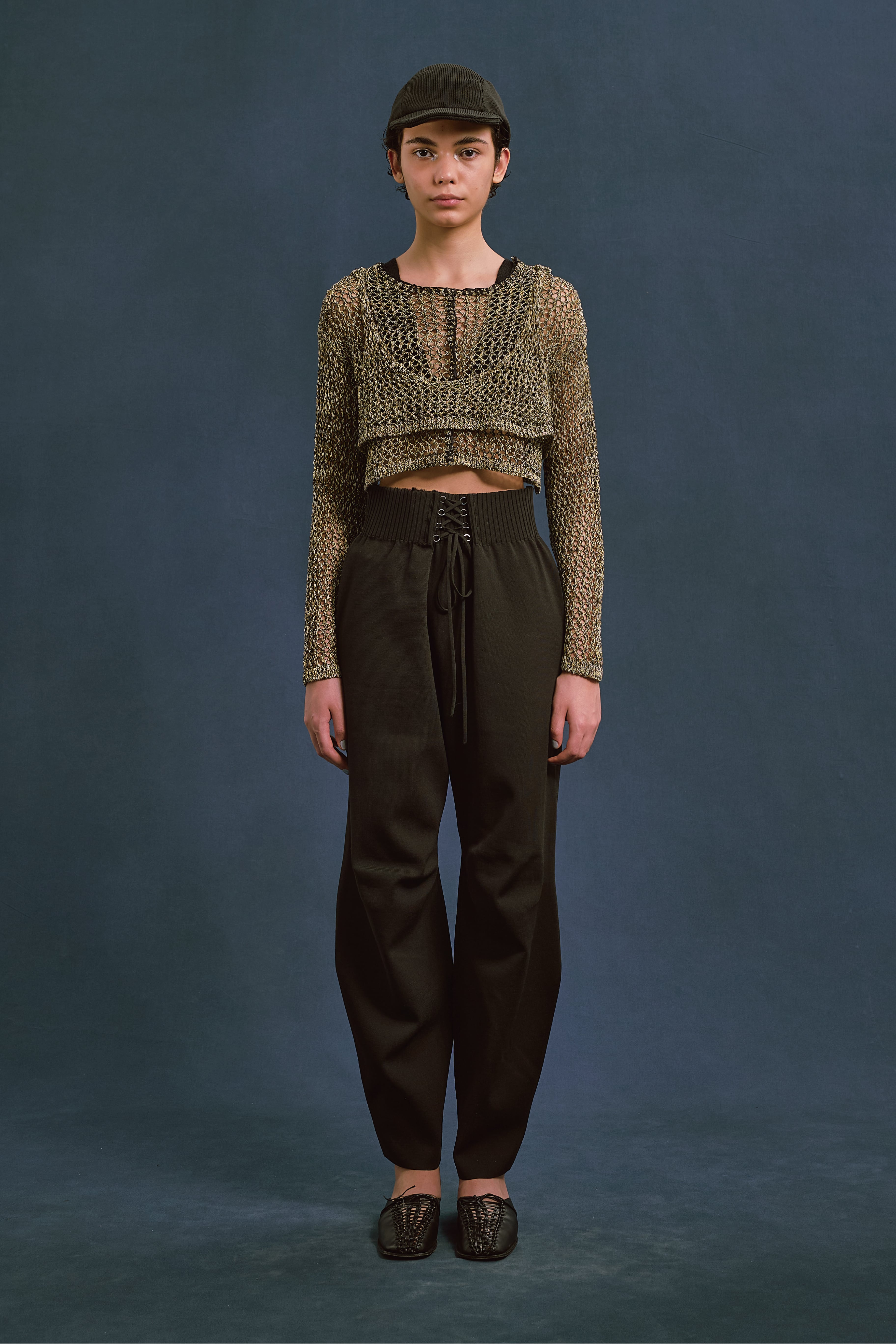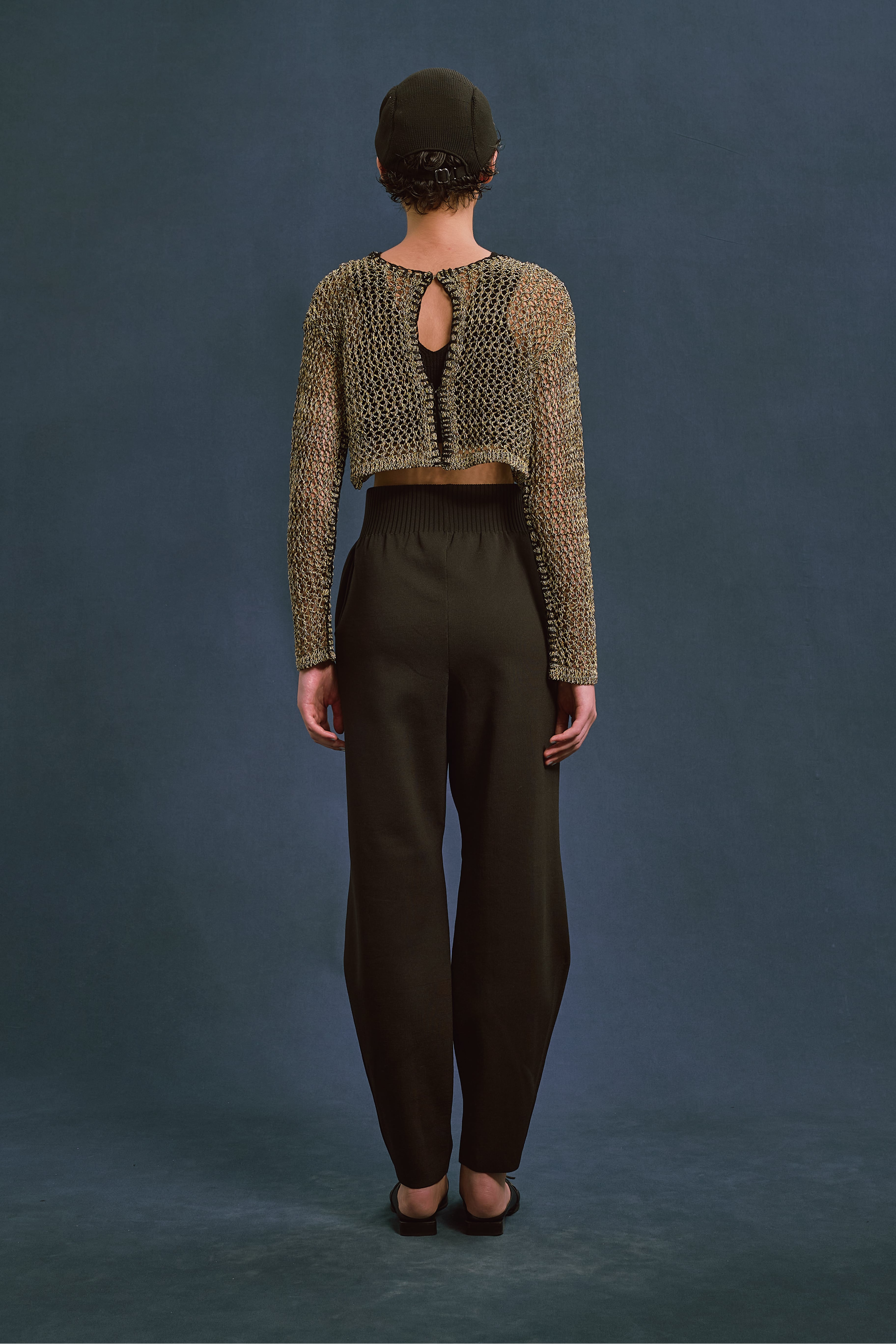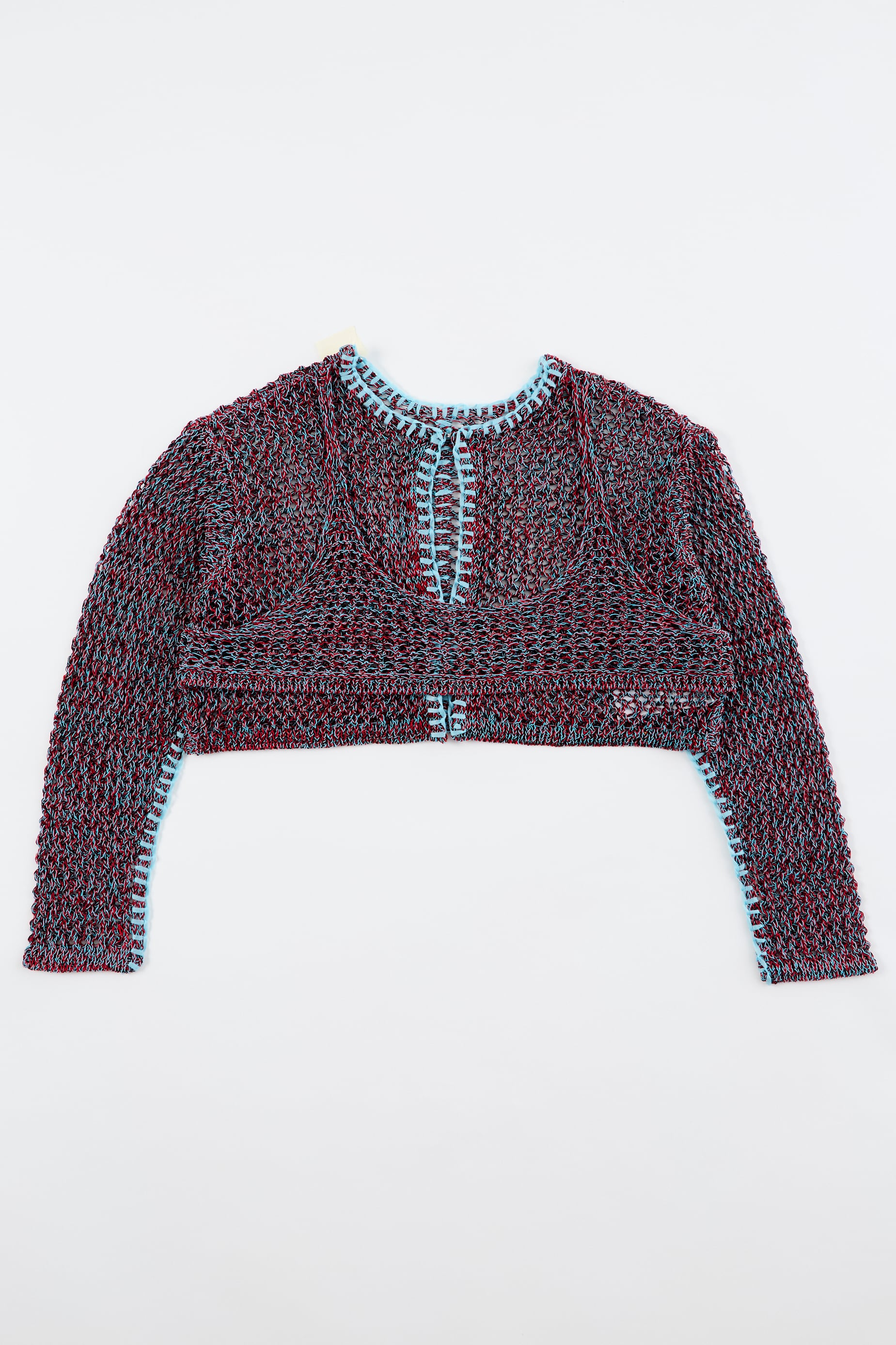 ほのかな光沢のあるコイルヤーンを使用。3色をミックスした立体感のあるメッシュ柄編み。端に施された不織布糸のブランケットステッチがポイント。胸元のブラトップパーツが重ね着ライクなデザイン。ブラトップパーツは後側に回して着用したりアレンジ可能。開きは2段のスプリングホック仕様。前後逆に着用可能で4WAYタイプ。